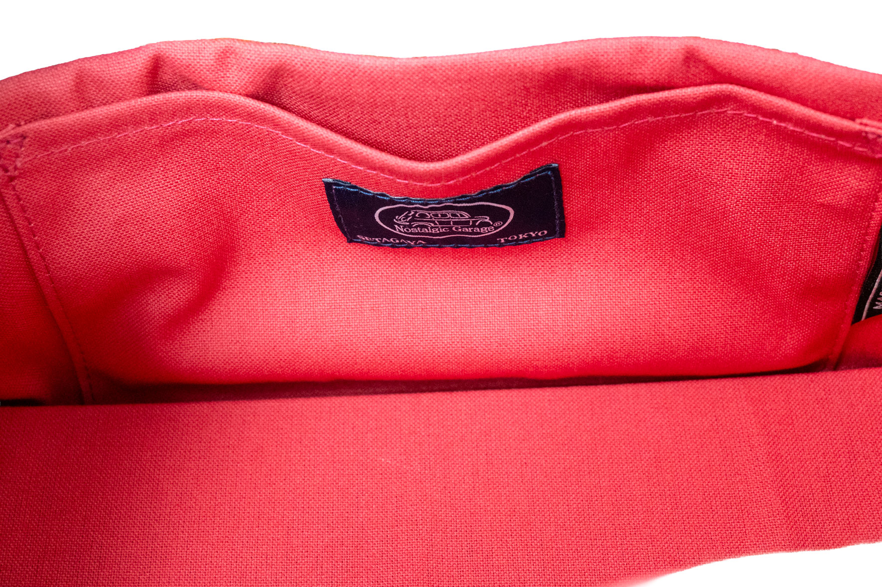 心躍る裏地のコントラスト: 内装には、マーガレットの花芯を思わせる鮮やかなピンクやレッドを配しました。バッグを開けるたびにパッと花が咲いたような明るい気持ちにさせてくれる、ノスタルジックガレージらしい遊び心溢れる配色です。