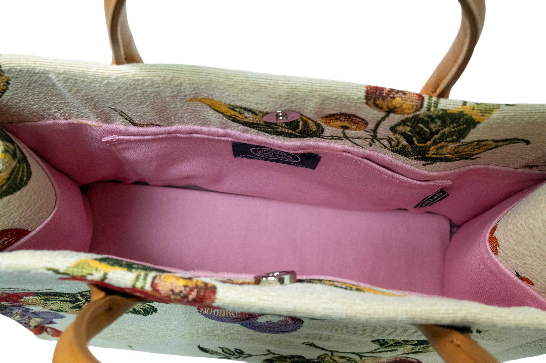 心ときめく、サクラ色の裏地: バッグを開けると広がるのは、優しいサクラピンクの裏地。フレッシュな果実のイメージとリンクした華やかな配色は、荷物を取り出すたびに心に春のような高揚感をもたらします。