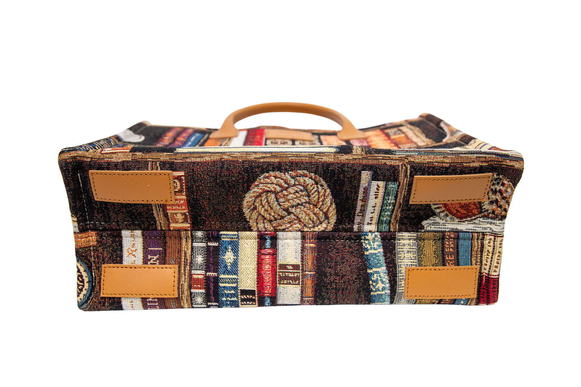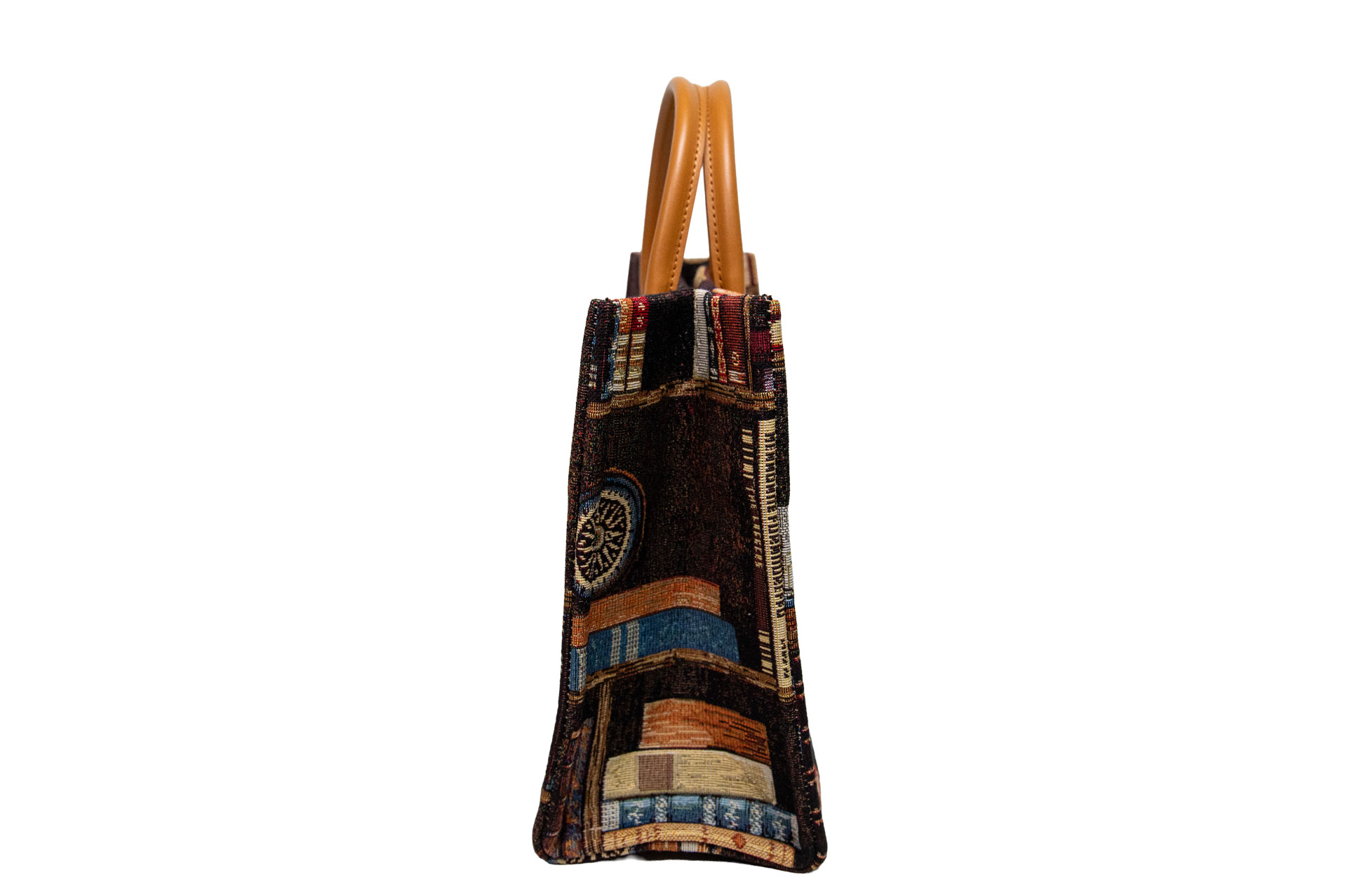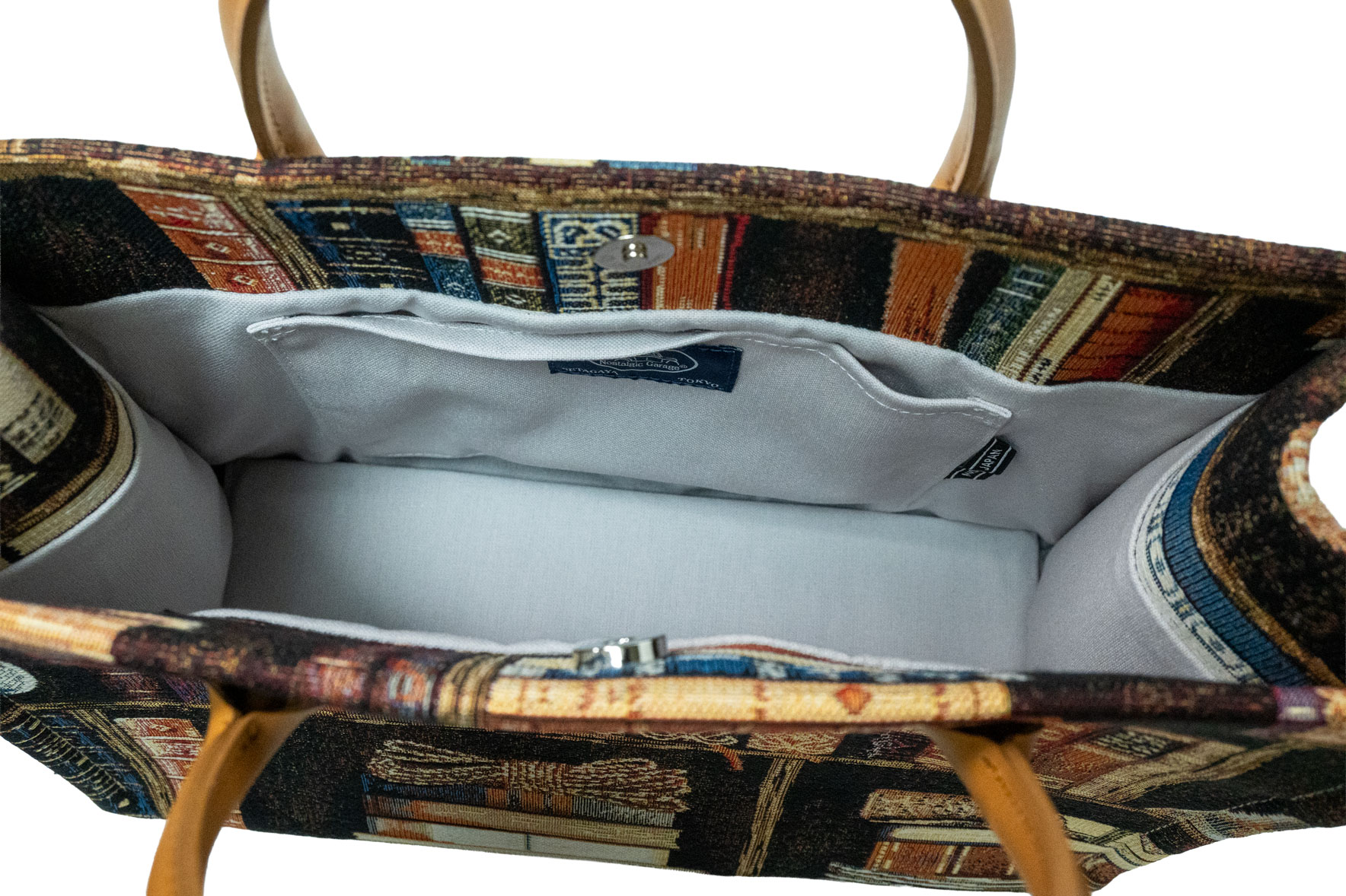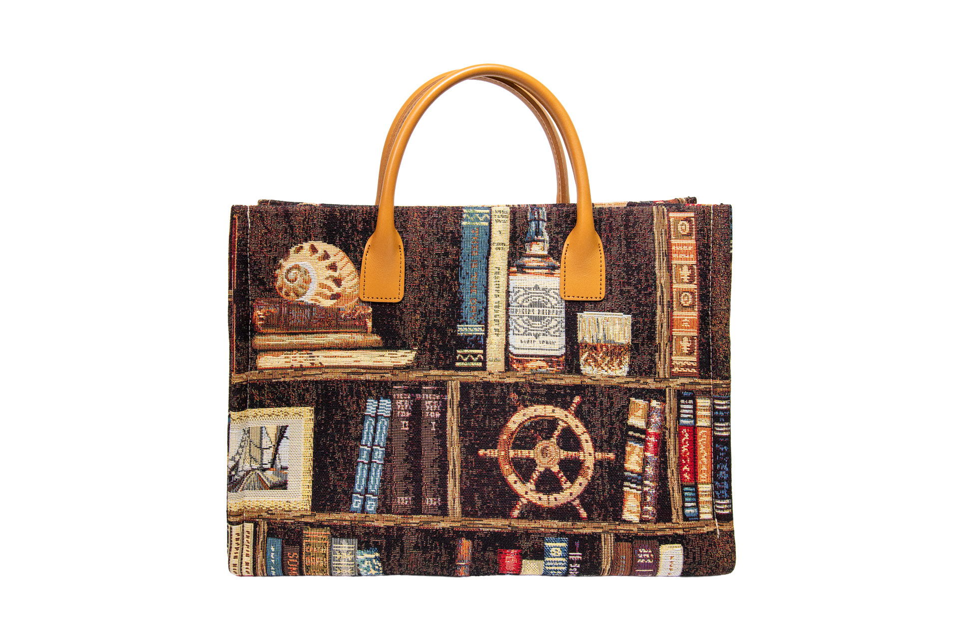 表と裏で異なる、二つの情景: バッグの前面には色とりどりの古書が並び、背面には羅針盤やボトルといった「旅」や「思索」を連想させるモチーフが配置されています。その日の気分やコーディネートに合わせて、見せる面を変えて楽しめる贅沢な仕様です。