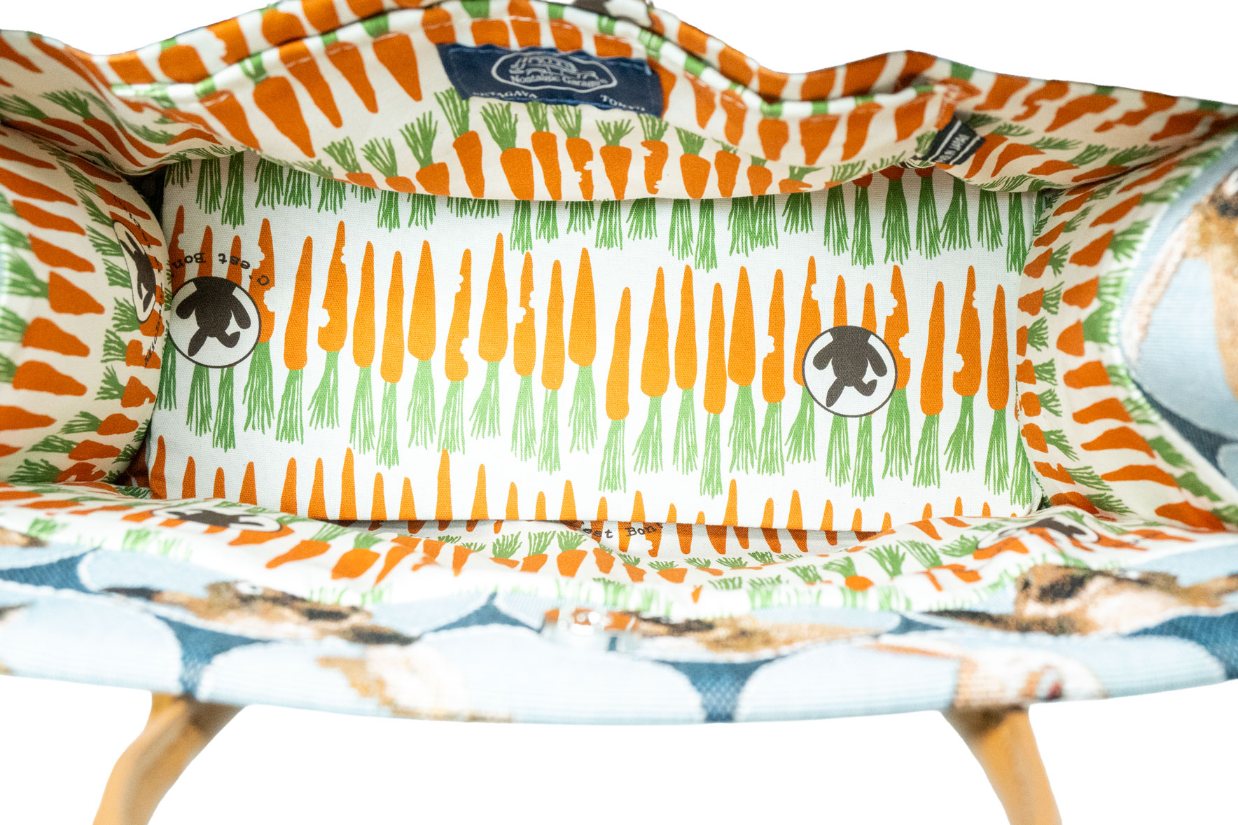 内装に隠された「にんじん」の秘密: バッグを開けると広がる、心躍るにんじん柄。実はこの裏生地も、ノスタルジックガレージがこのシリーズのために製作した完全オリジナルテキスタイルです。表のうさぎたちが今にも飛び込んできそうなユーモア溢れる演出は、使う人だけが知っている贅沢な仕掛けです。