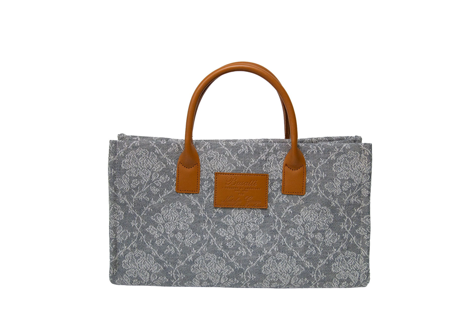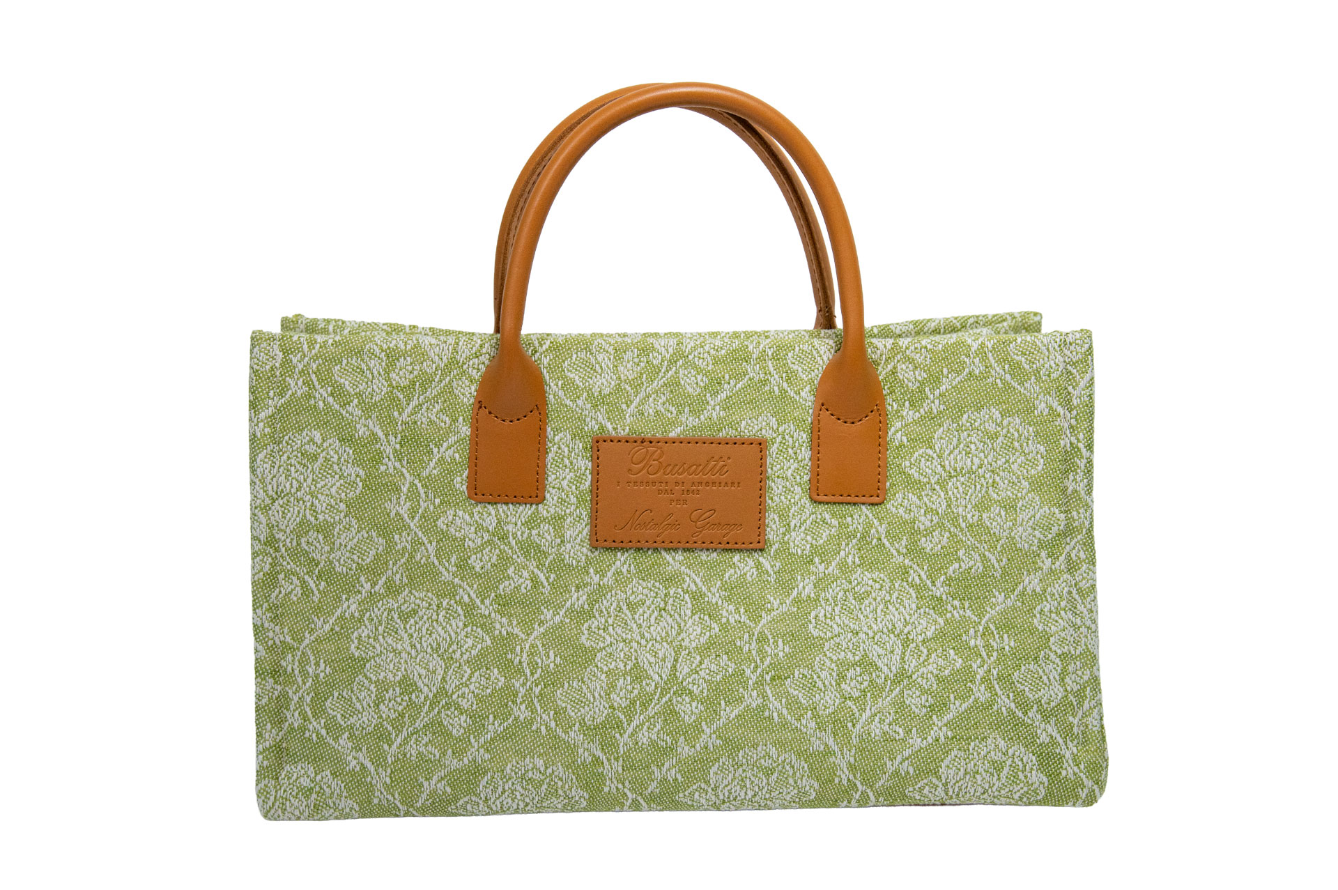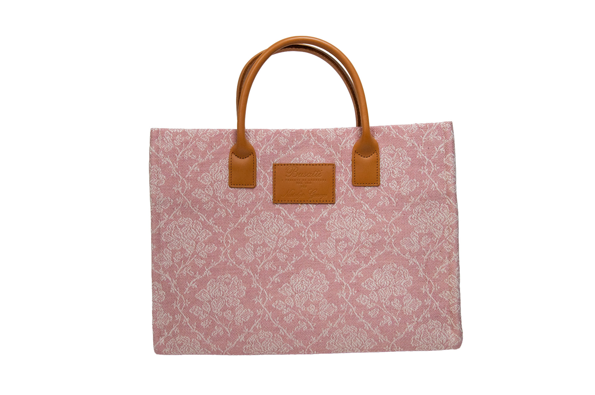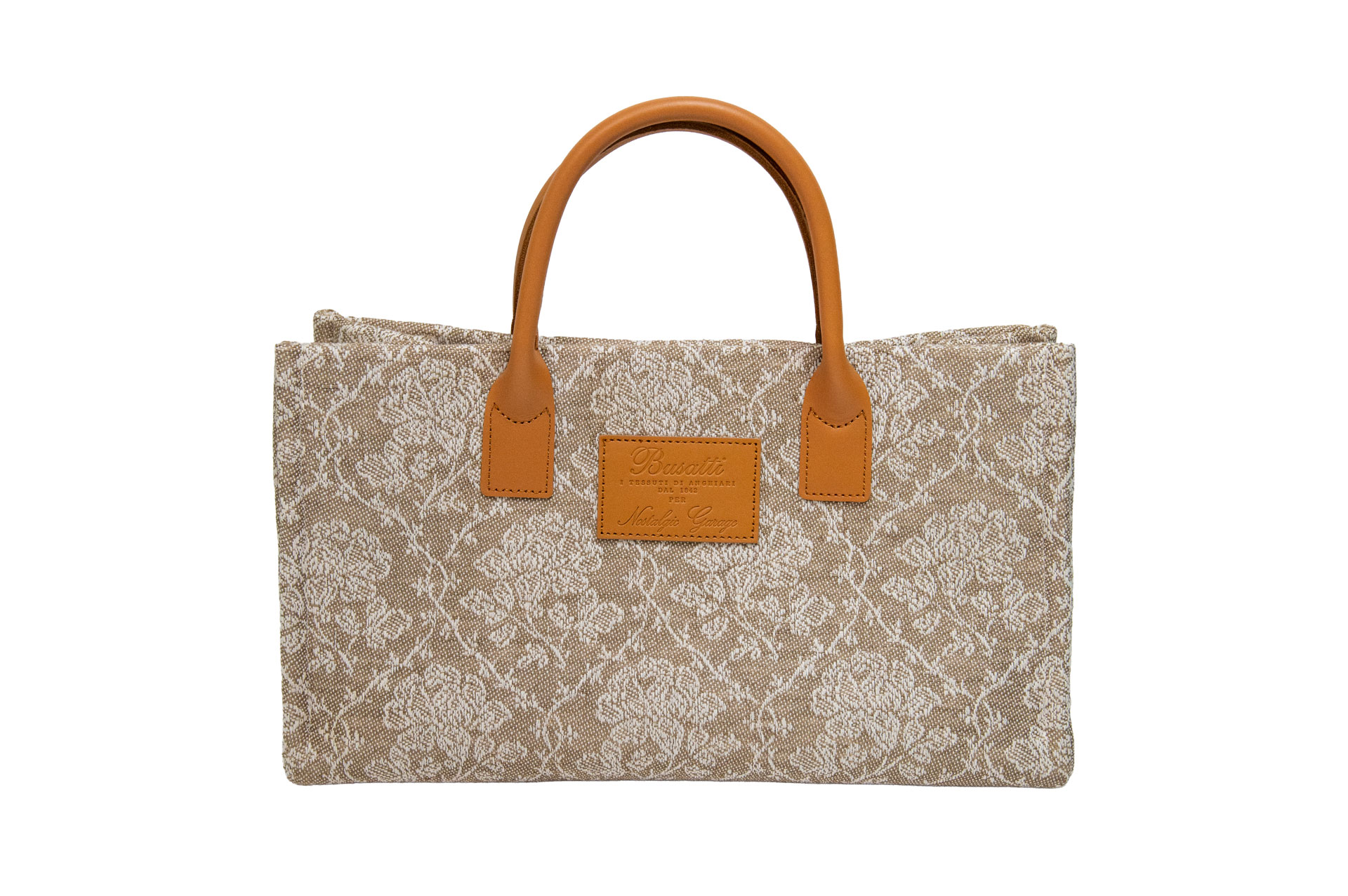 天然素材を支える、上質なキャメルレザー: 繊細な薔薇のジャガード織りを引き締めるのは、手馴染みの良い日本製の牛革ハンドル。ブサッティ社のロゴが刻印されたレザーパッチが、歴史あるテキスタイルの存在感をより一層際立たせます。