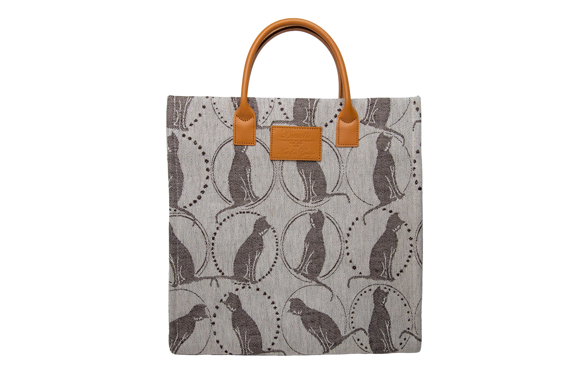 描かれているのは、凛とした佇まいでこちらを見つめる猫のシルエット。Bussatti社が培ってきた伝統のシャトル織機により、猫の柔らかな曲線と繊細な表情が、リネンコットンの豊かな風合いの中に息づいています。ブランド同士の絆が生んだ、まさに「友情の証」ともいえるスペシャルな一品です。