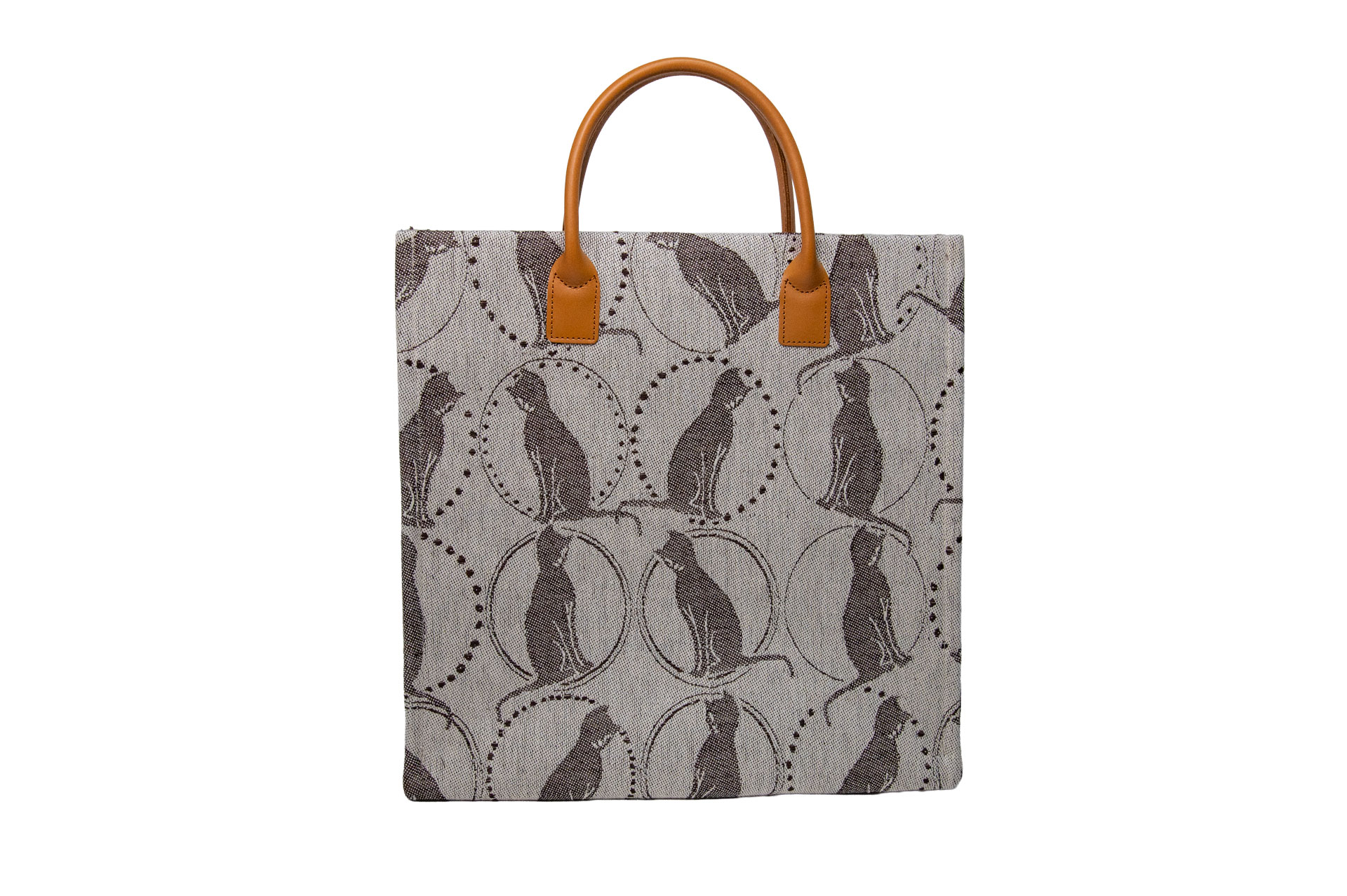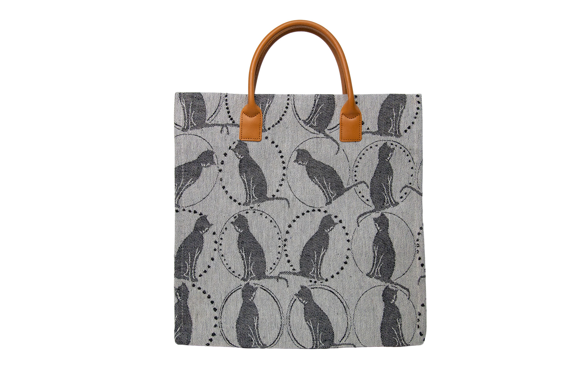 ノートPCやA4ドキュメント、雑誌も余裕を持って収まる大容量設計。縦長のフォルムが猫の総柄を美しく見せ、スタイリッシュな印象を与えます。