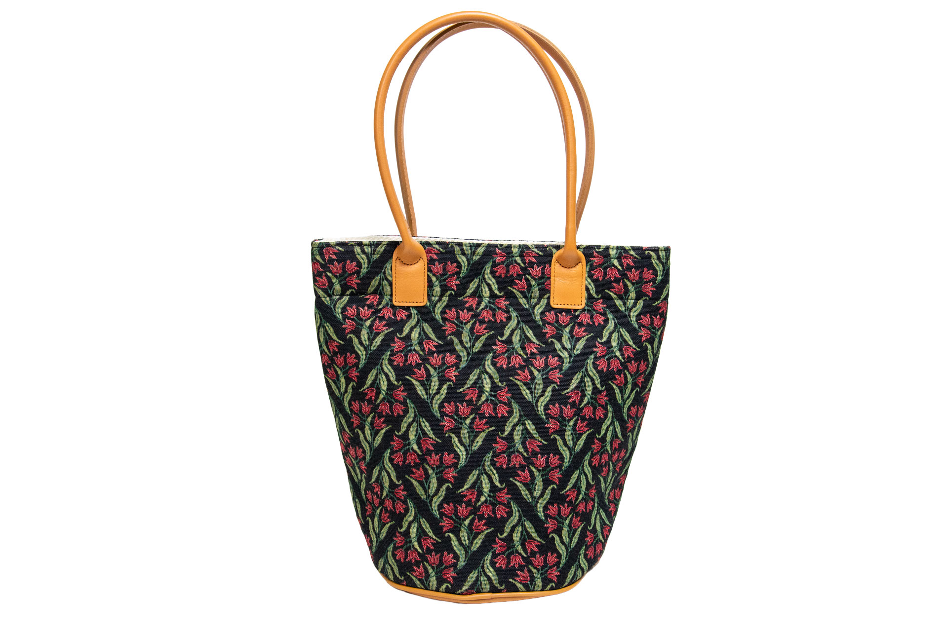 形状は、底に丸みを持たせた柔らかなバケット(バケツ)型。角のないフォルムが、クラシックな花柄の魅力をより一層引き立てます。長めのハンドルは肩掛けもスムーズで、見た目以上の収納力と軽やかさを兼ね備えた、機能美あふれる一点です。