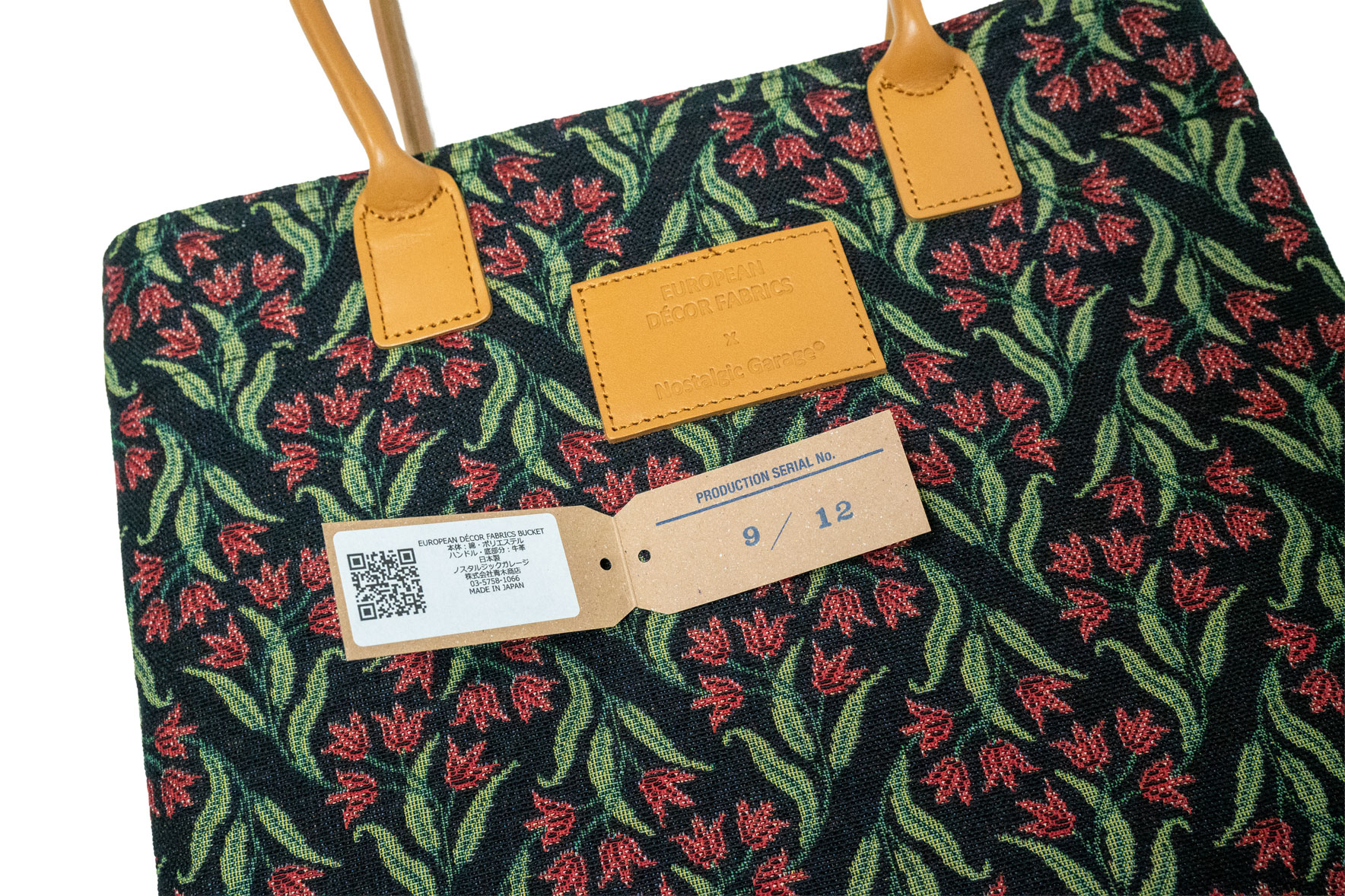 ヨーロッパのインテリアシーンを彩る高級なデコールファブリックを使用した、独創的なバケットトート。今回ご紹介するのは、深い漆黒(NERO)の地に、可憐な赤い花々がテキスタイルのように美しく並ぶ「NOSTALGIC FLOWERS」です。