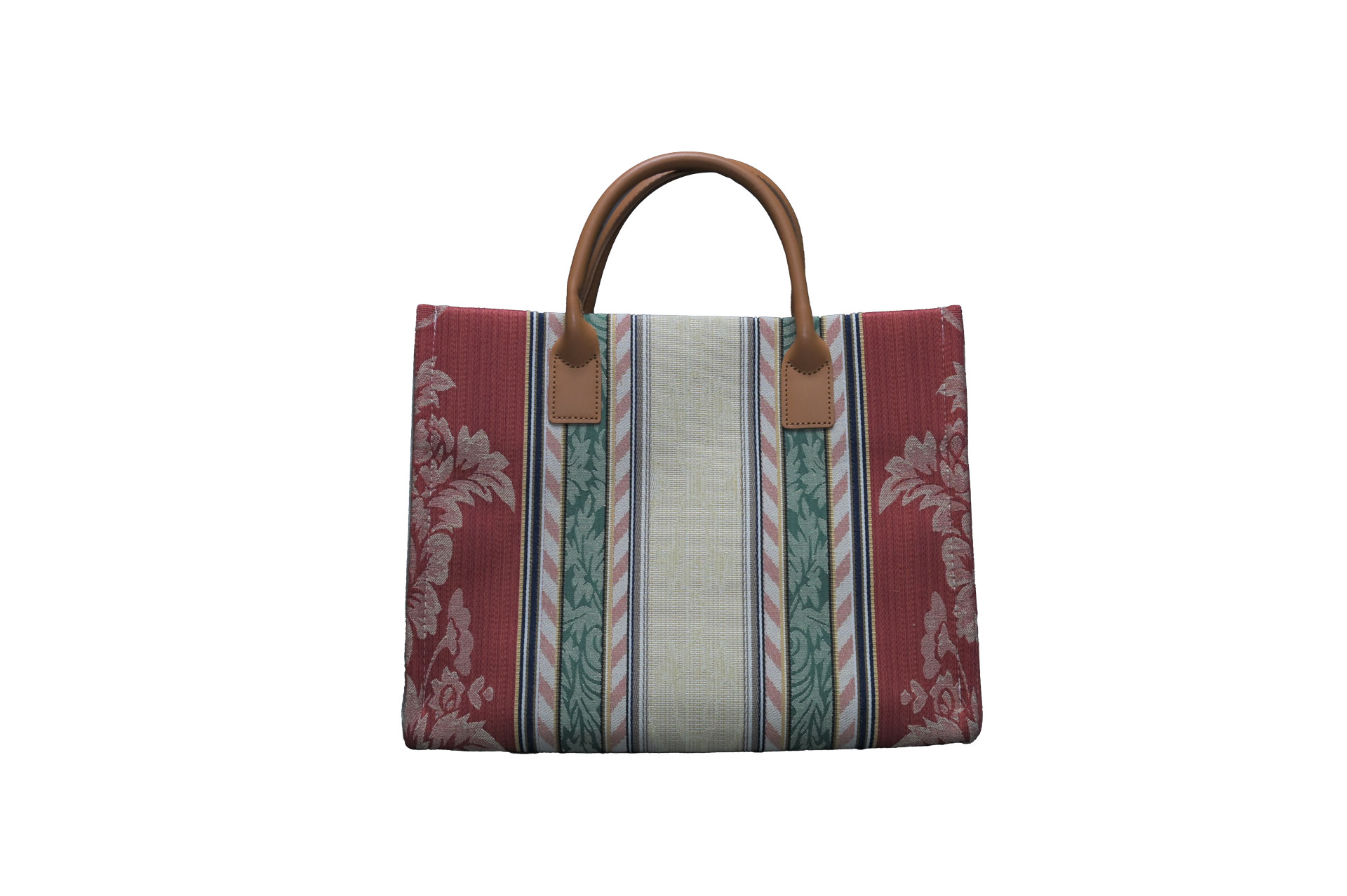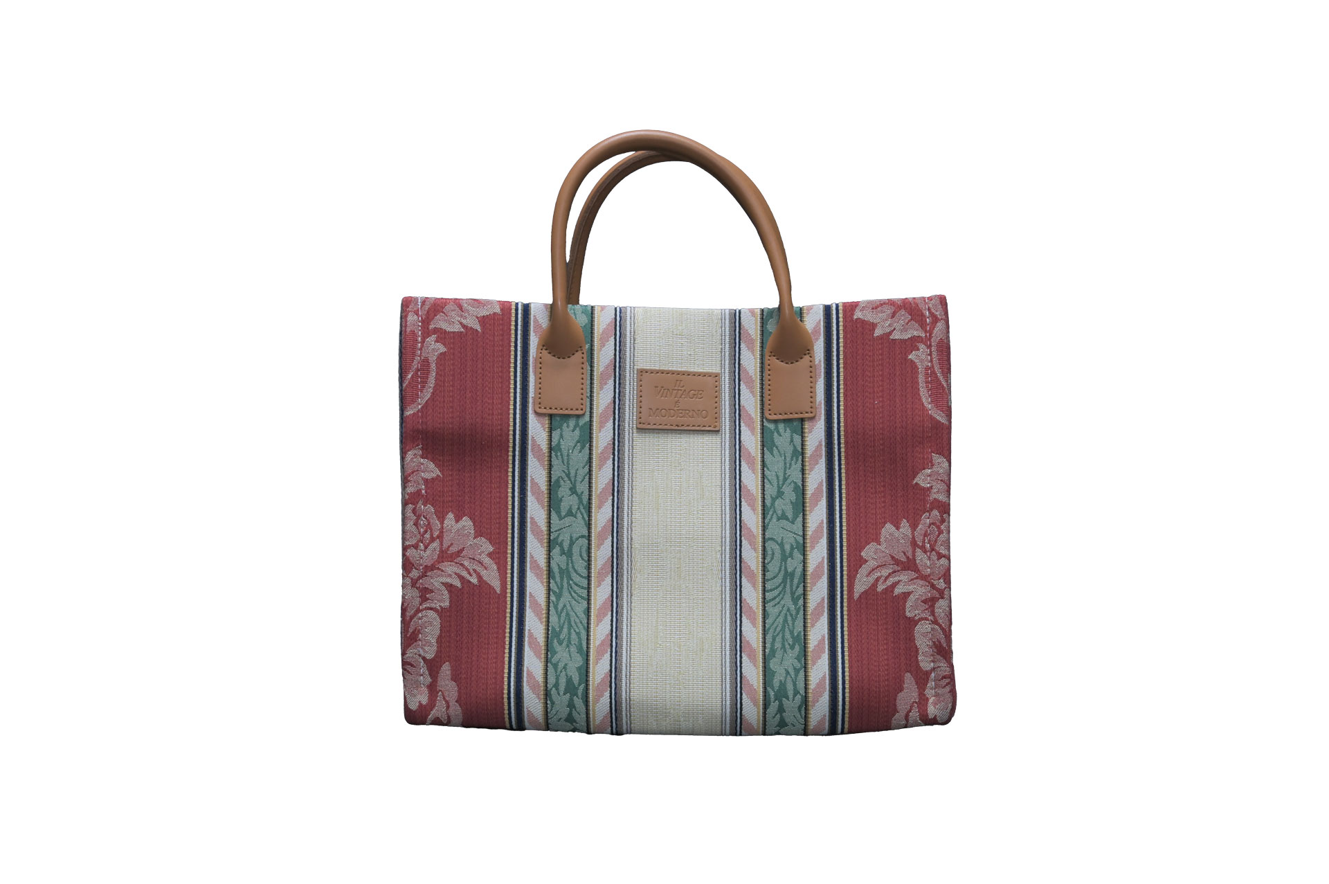 ヴィンテージ特有の落ち着いた発色と、ジャガード織りによる立体的な質感は、現代のプリント生地にはない圧倒的な存在感を放ちます。上質なイタリアンレザーのハンドルと合わせることで、クラシックな気品と現代的な使いやすさを両立させました。