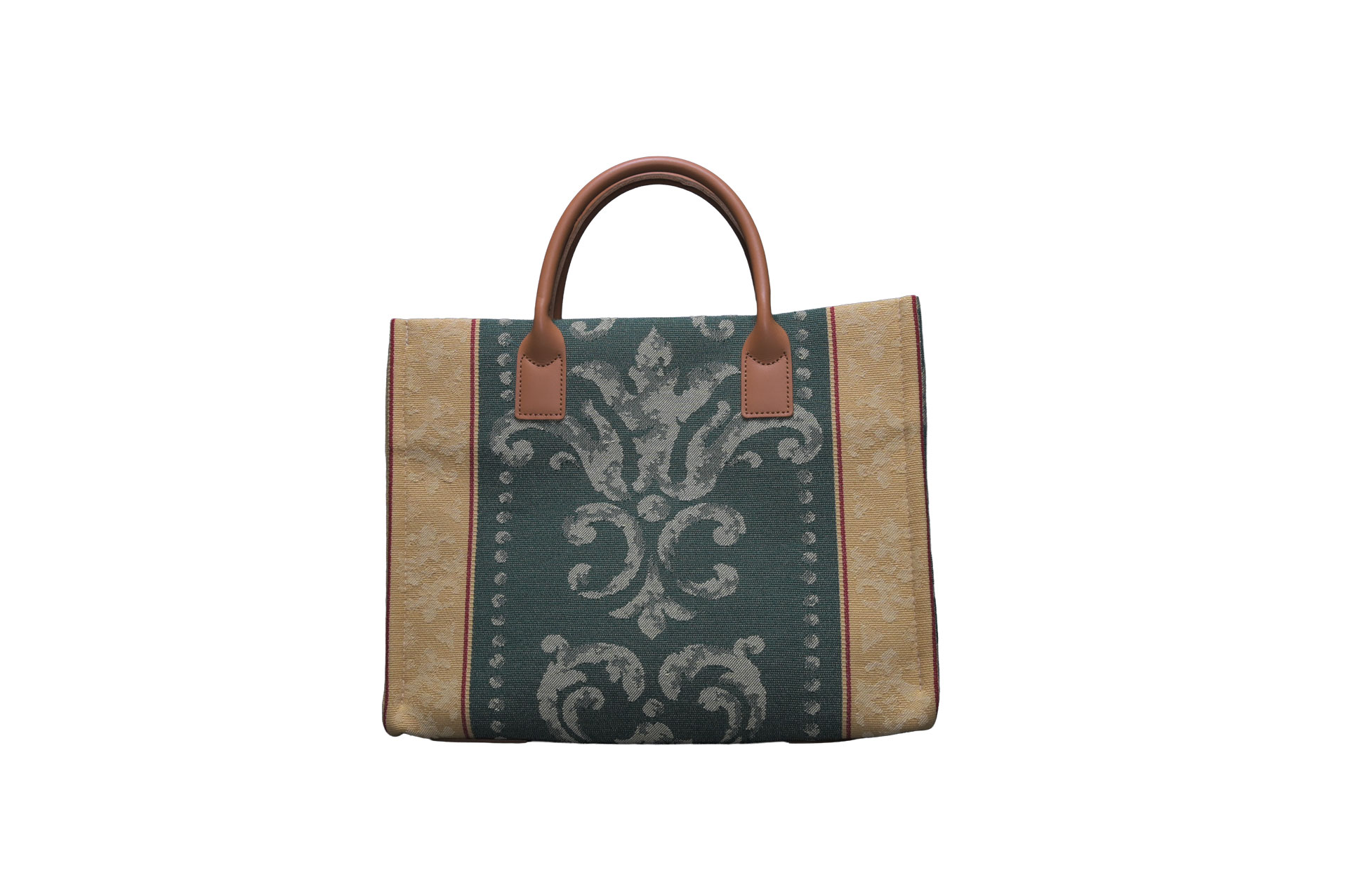 この時代の生地は、伝統的な意匠はそのままに、合成繊維をブレンドすることで耐久性を飛躍的に向上させた「実用的な芸術品」としての側面を持ちます。イタリア各地のコレクターの協力を得て奇跡的に発掘されたこのテキスタイルは、深みのあるROSSO(赤)、高貴なVERDE(緑)、そして随所に光るORO(黄金)が織りなす圧倒的な存在感が魅力です。