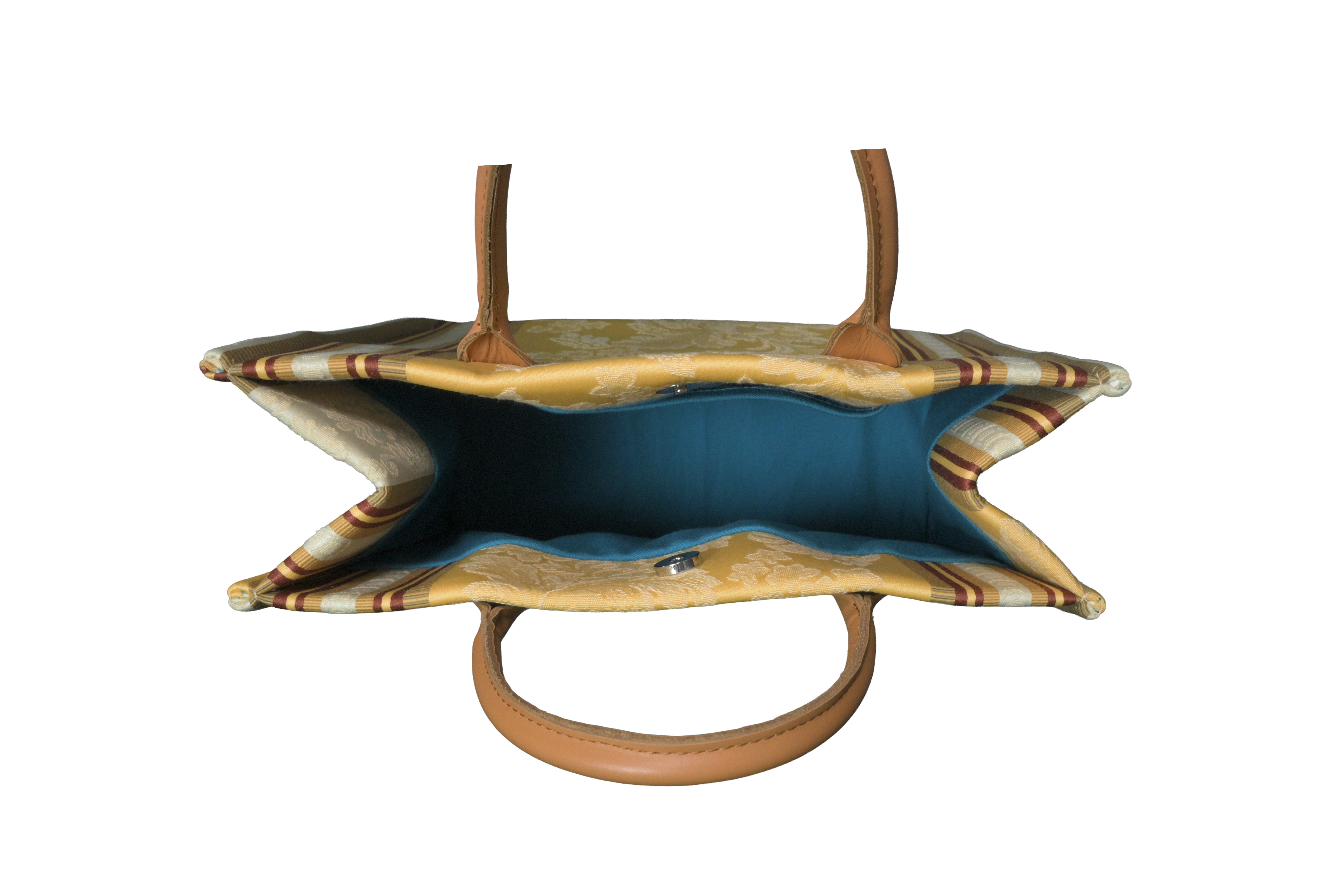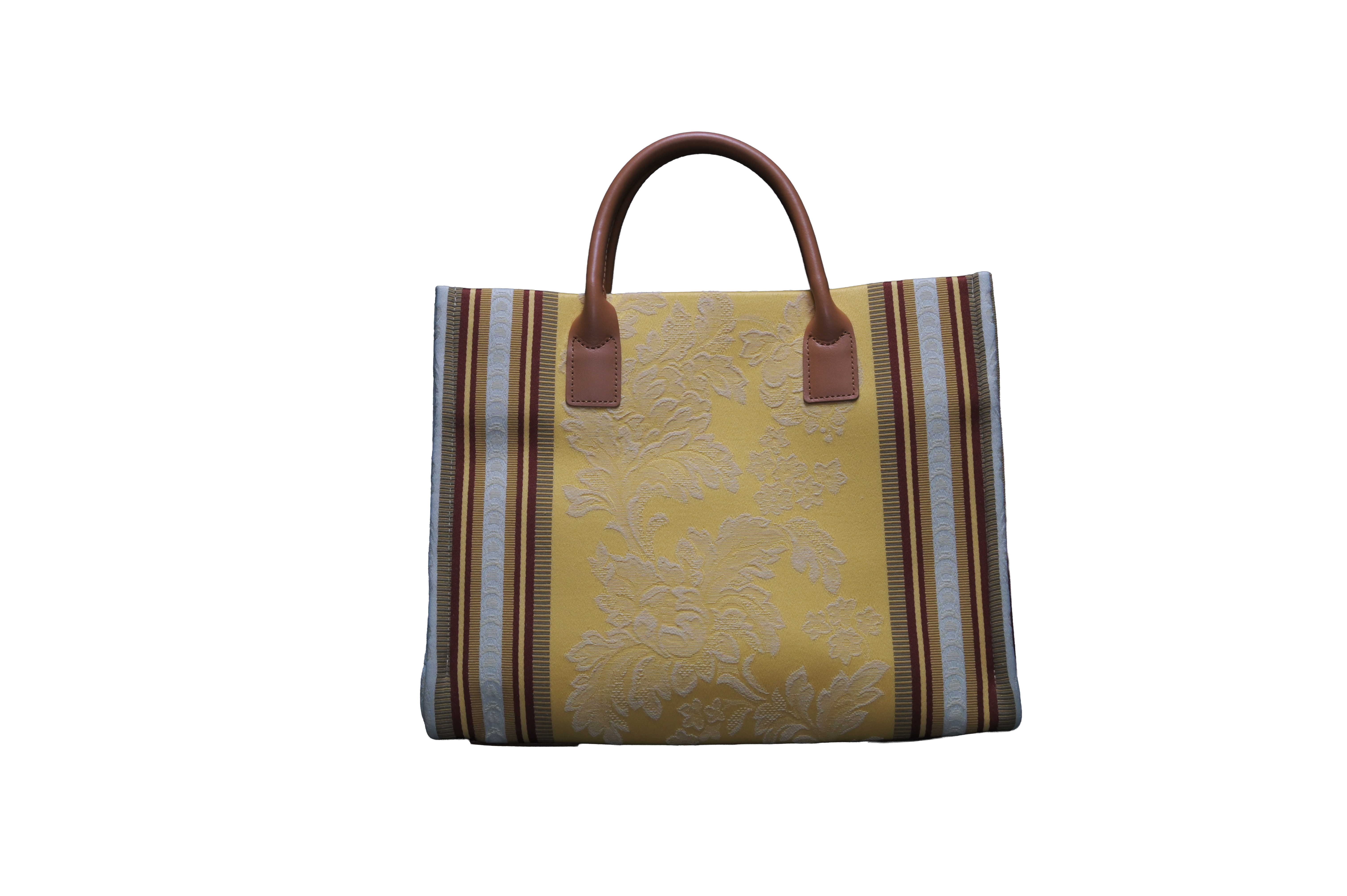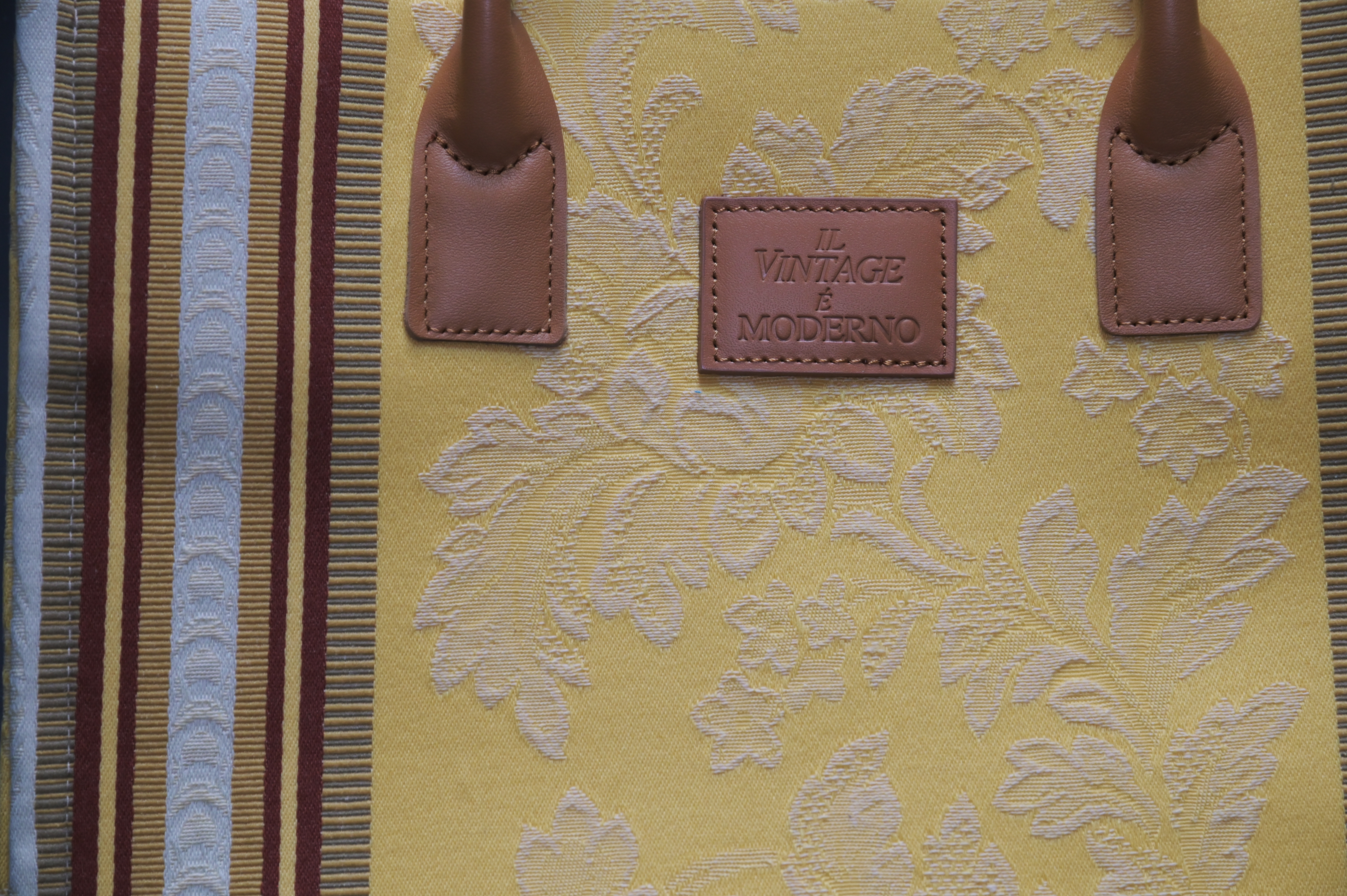 イタリア各地のコレクターの手により、当時のままの美しさで保管されていた希少な生地。日本の熟練した職人が、その重厚な質感を現代のトートバッグへと再構築しました。