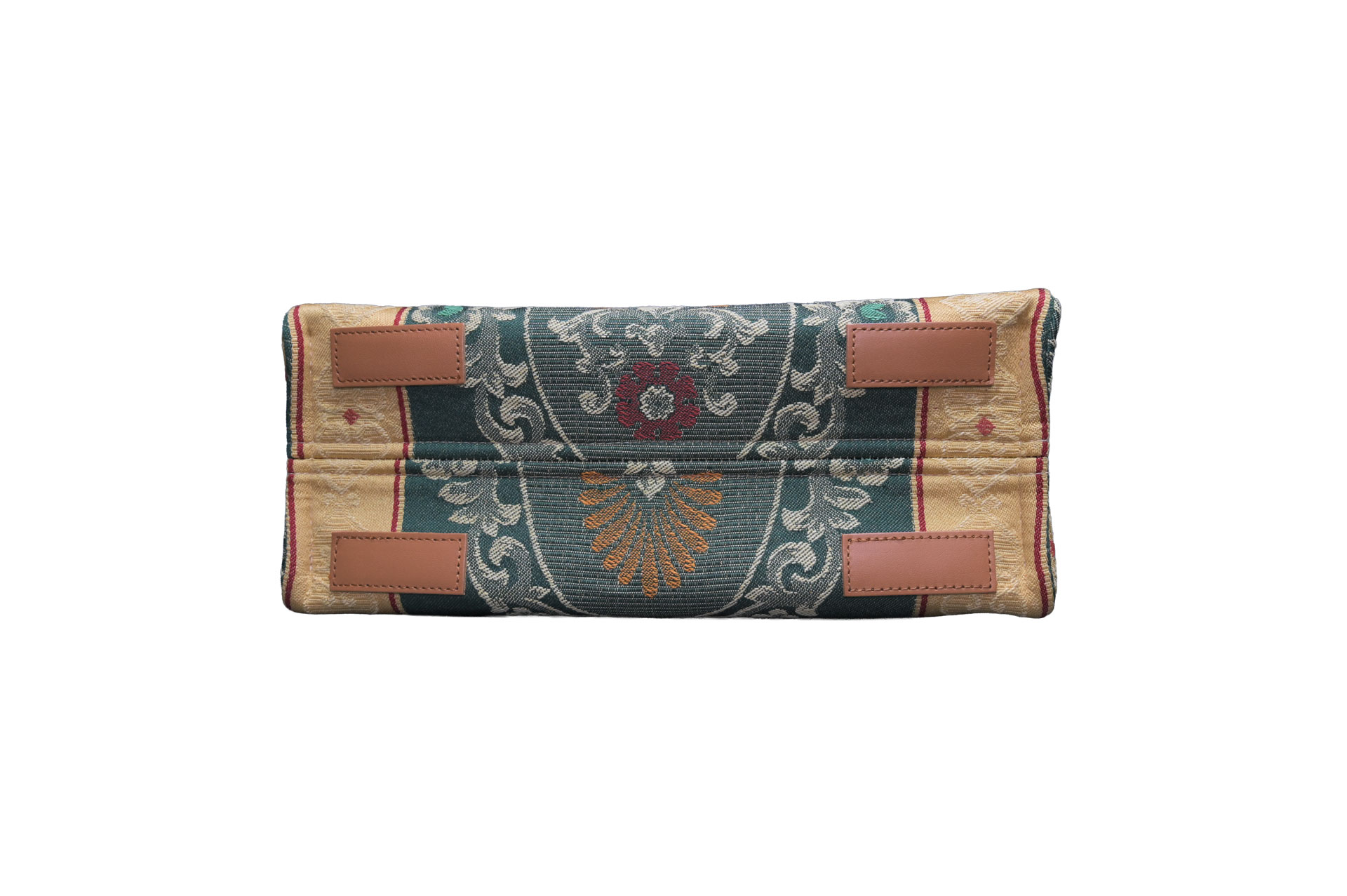 サイドにあしらわれたベージュの帯状の紋様が、重厚なセンターデザインに現代的な抜け感を与え、アンティークのような風格と日常に馴染む使いやすさを両立させています。イタリア各地の生地コレクターの手を経て守り抜かれた、極めて希少なテキスタイルです。